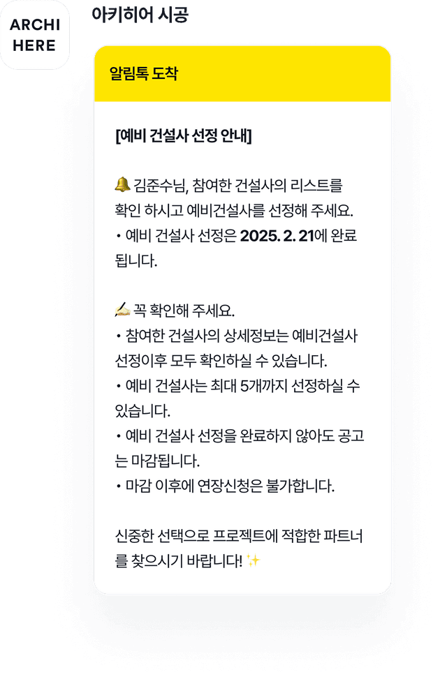 입력한 건축 개요를 바탕으로, 여러 건설사들이 맞춤 제안을 받을 수 있어서 쉽게 비교할 수 있어요.
