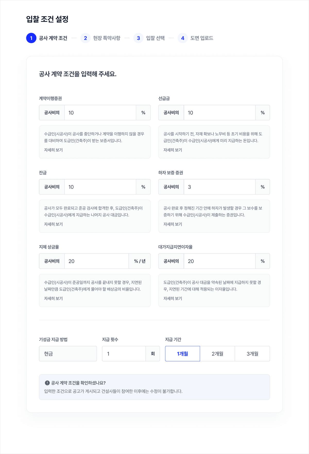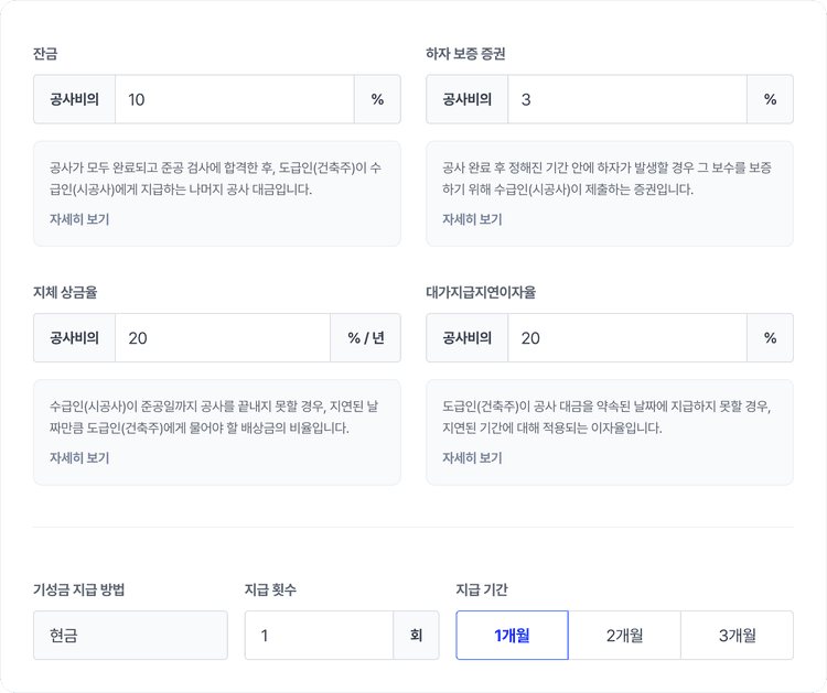 계약 조건별 평균값과 설명 가이드를 제공해, 계약 경험이 적어도 누구나 적정 조건을 바로 선택할 수 있어요.